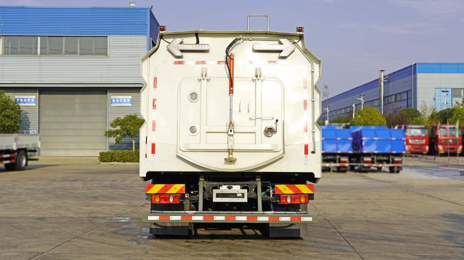 清水箱充分利用了車載空間,容積大,可達 8m3。垃圾箱采用單層 304 不銹鋼結構,傾翻卸料,帶高壓自潔
