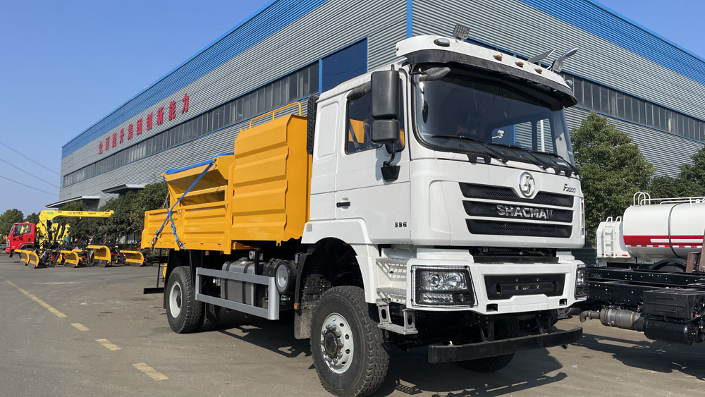 一、底盤配置: 采用陜汽德龍SX1189LA1F1C車身,配置玉柴B6.2NS6B210發(fā)動(dòng)機(jī)154/210馬力,國(guó)六排放標(biāo)準(zhǔn),軸距4700,5100,5300(mm),整備質(zhì)量8.8噸,額定載質(zhì)量9.305噸,五擋變速箱,帶動(dòng)力轉(zhuǎn)向,帶原廠空調(diào),該車專用裝置為融雪劑撒布機(jī),主要用于冬季道路除雪.該車僅在除雪作業(yè)時(shí)安裝除雪鏟和除雪滾刷.僅選用4000,4500,4700軸距(mm);車該車上黃牌,城區(qū)道路請(qǐng)注意限行標(biāo)識(shí)。