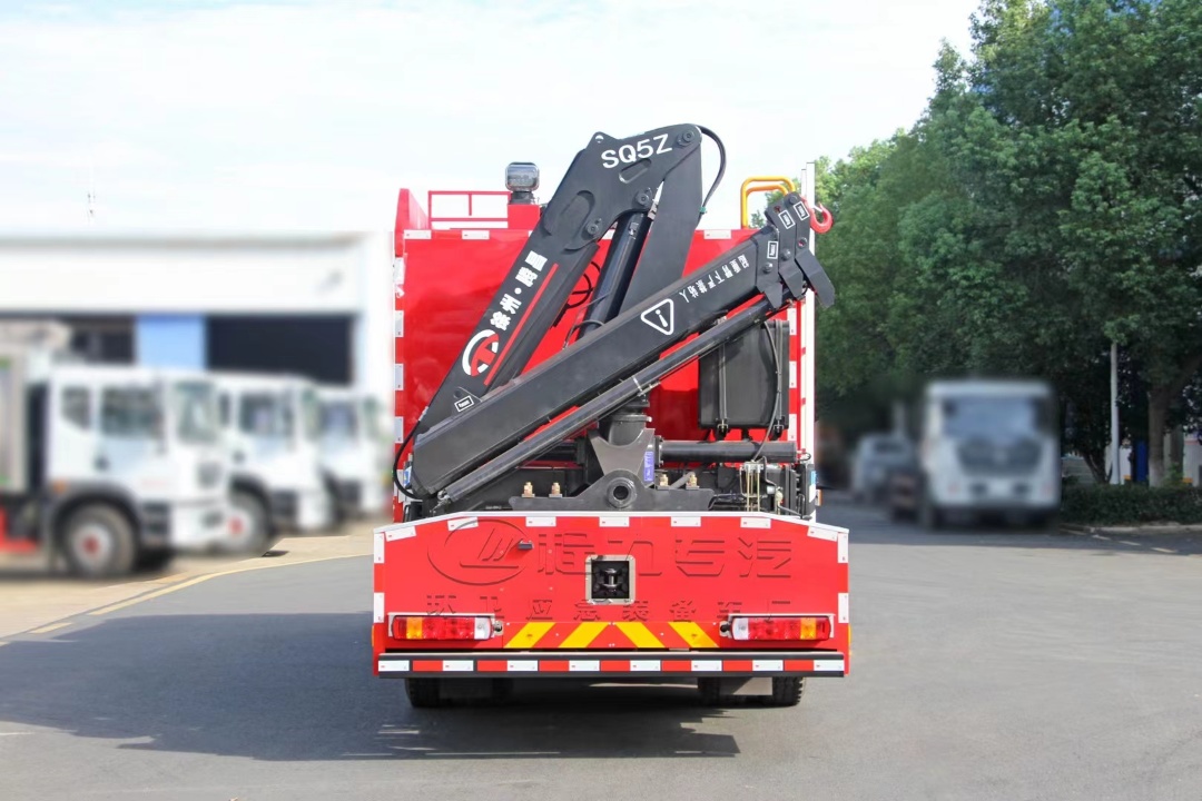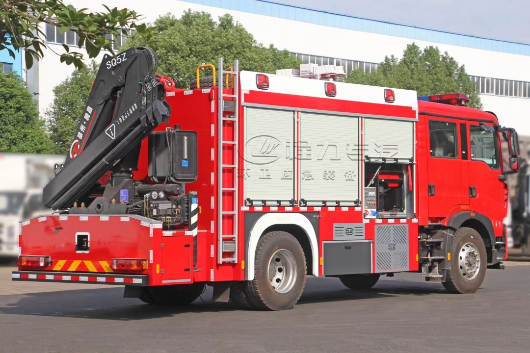 重汽豪沃搶險救援消防車,前拖后吊,具有起吊、自救/牽引、清障、發電、照明等功能,可裝備大量的破拆、偵檢、堵漏、防護等各類消防器材或工具;
